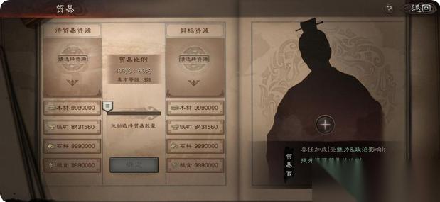 贸易官的核心属性为魅力和政治,其中魅力对贸易收益的影响更为显著。每增加1点魅力可提升0.02%的贸易比例,而政治属性的加成效果约为魅力的一半。优先选择魅力值高的武将担任贸易官是提升资源交换效率的关键策略。