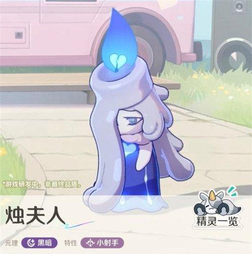 如果大家在游戏当中获取了烛夫人这个精灵的话,其实关于她的外观上面看是非常能够很快辨别出来的,因为她的外观上面就是一个蜡烛一样的形态,这个烛夫人把她辨别为女性精灵的话,上面的蜡烛滴落下来的形状就特别像头发,而且在游戏当中,因为她的元理是黑暗属性的,所以在整体表现上面也是表现的气质比较忧郁,当然最独特的是她头上的火焰散发着蓝紫色的光芒,这种特效跟她的后期特性也有一定相关联的地方。
