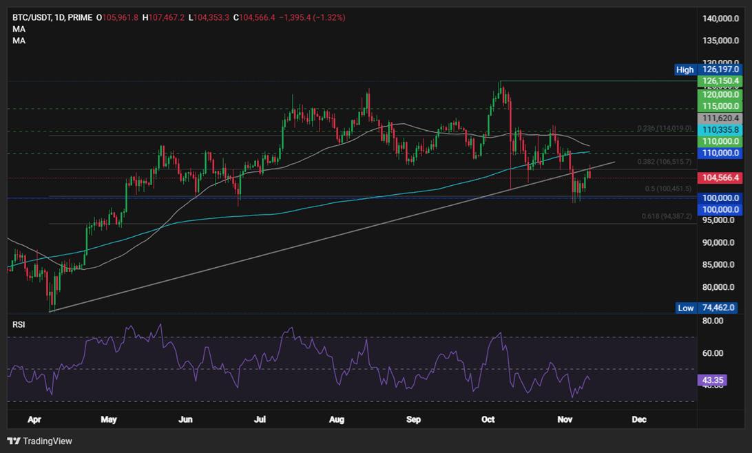 比特币自 10 月 6 日创下历史新高以来,一直处于下跌通道中,并在 99,000 美元附近找到支撑。价格已从 11 月的低点 99,000 美元反弹,但在 106,500 美元附近遇到阻力,该阻力位位于 74,400 美元低点和 126,600 美元高点的 38.2% 斐波那契回撤位。