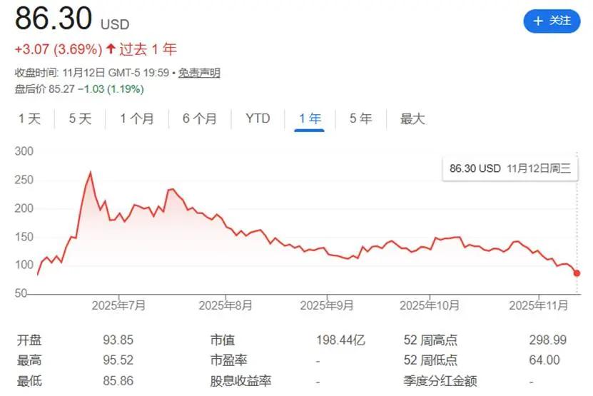 自2025年6月以31美元定价完成IPO以来,Circle股价经历大幅波动,从高点298.99美元回落至当前86.3美元,总市值已缩水超70%。