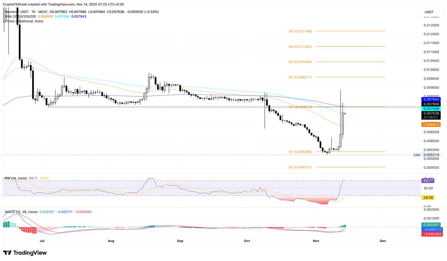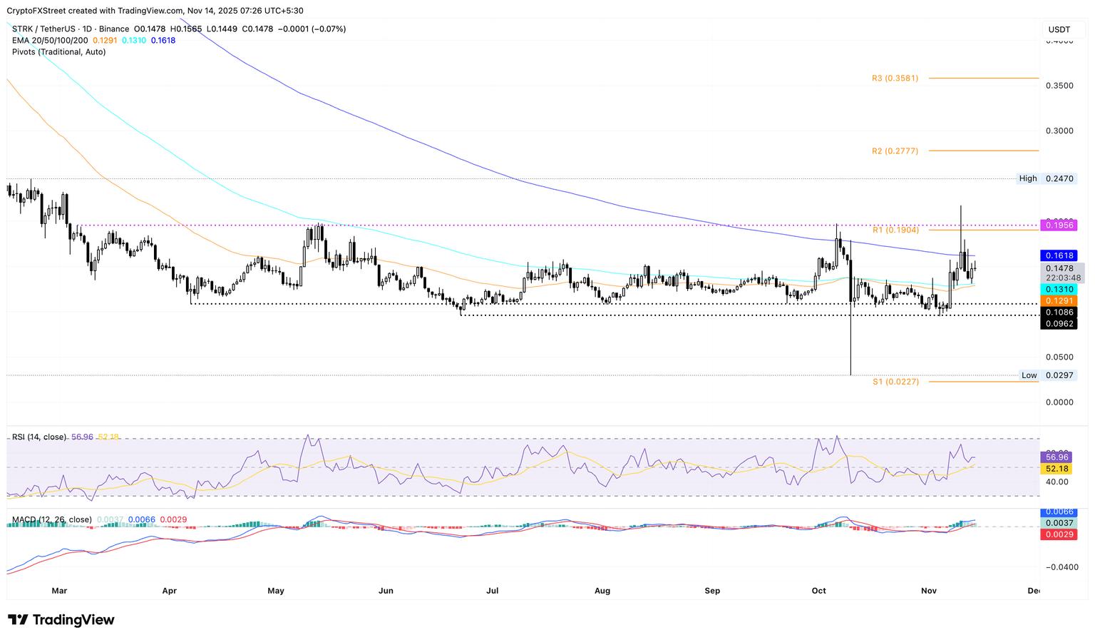 如果 STRK 价格超过 200 日均线 0.1618 美元,则可能向 0.1956 美元的上限迈进。