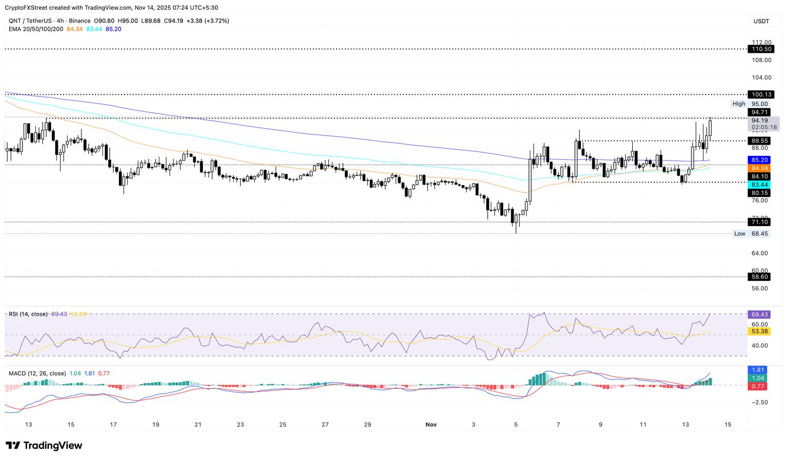 Quant 延续了 4 小时图上盘整区间的突破,正如之前预期的那样。FXStreetQNT价格正接近94美元的阻力位,该阻力位是10月13日的高点。