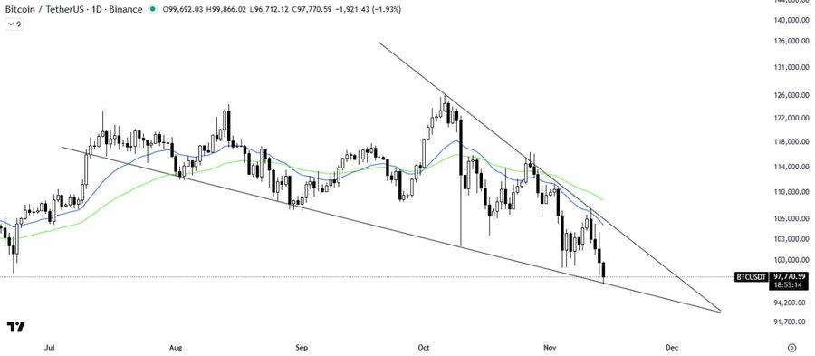 过去24小时内,比特币下跌了6.2%,月度跌幅进一步扩大至13.6%。目前价格比10月初创下的12.7万美元的历史高点低了约23%。