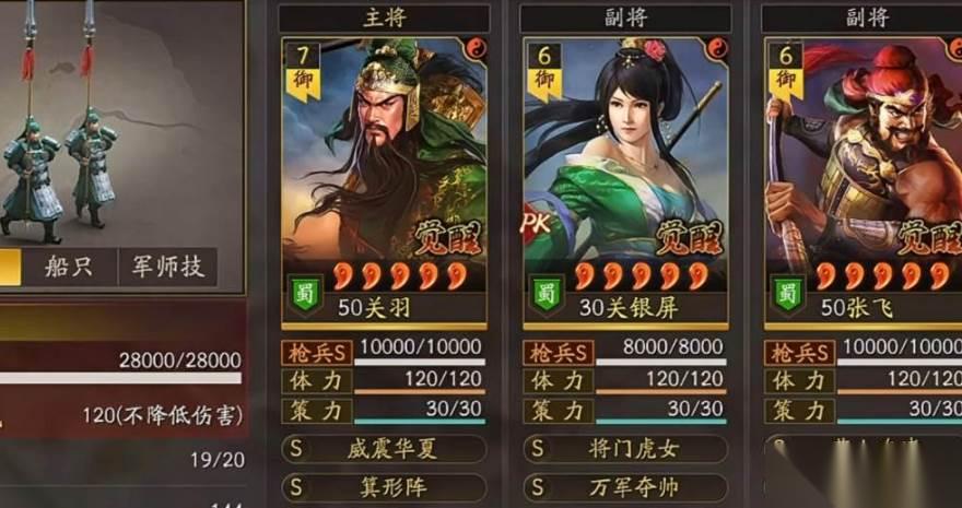 网红枪的弱点是五十满科技之后,dps会有所疲软。第三种队伍是群弓,它在定军山中常常作为碰瓷队来用。里面的角色对红度要求不高,因为它完全靠控制来碰瓷。就算手中没有SP朱俊,用紫色也能打出出色的成就。定军山有好用旗阵的情况下,碰瓷会变得更加丝滑。第四种队伍是关关张,其中关羽的标配是威震、威谋以及箕形阵。关银屏需要带上盛气、青州兵以及将门虎女等等, 至于张飞可以带上燕人、横扫以及据水。关关张的战法搭配不是固定的,仅需有盛气、横扫以及箕形阵就行。