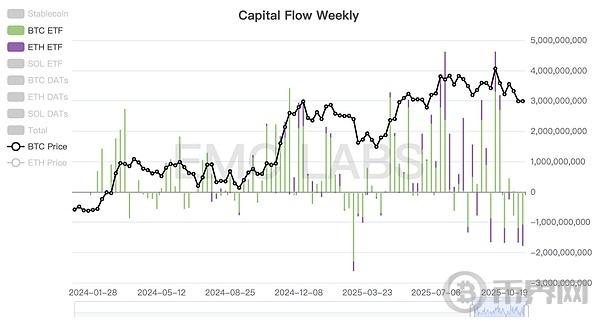 在本周期的主要买家中,BTC ETF通道已经转为卖出,据媒体信息DATs公司Strategy和BMNR本周依然在市场扫货,但独力难撑。最终BTC、ETH均以大幅下跌告别本周。
