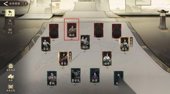 2.最重要的来了,尽可能的把红色品质的“韩浩”在第一时间点亮,他在副将图谱的这个位置;