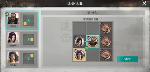 英雄站位:许诸站在貂蝉和郭嘉的追击格上;郭嘉站在许诸的追击格上;貂蝉无需踩追击格。