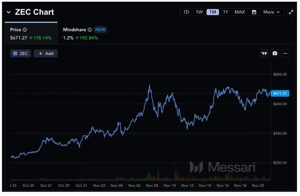 然而,尽管比特币一路暴跌,隐私币 Zcash (ZEC) 却一路飙升,过去一个月价格上涨了 178%。此外,据 Messari 数据显示,Zcash 的市场关注度也高达 192%,吸引了众多目光聚焦于市值排名前 100 的加密货币中唯一一片上涨的 Zcash。自 10 月初以来,ZEC 的价格已累计上涨 1500%。