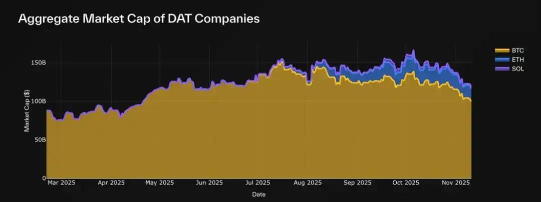 2025 年迎来了 DAT Summer,随着 Bitmine (BMNR)、Sharplink (SBET) 和 Solana Company (HSDT) 等 DAT 进入主流,该领域迅速扩张。目前我们追踪的 30 支 BTC、ETH 和 SOL DAT 总市值已达 1170 亿美元。然而,在市场冲击后,初期的炒作热潮已开始降温。