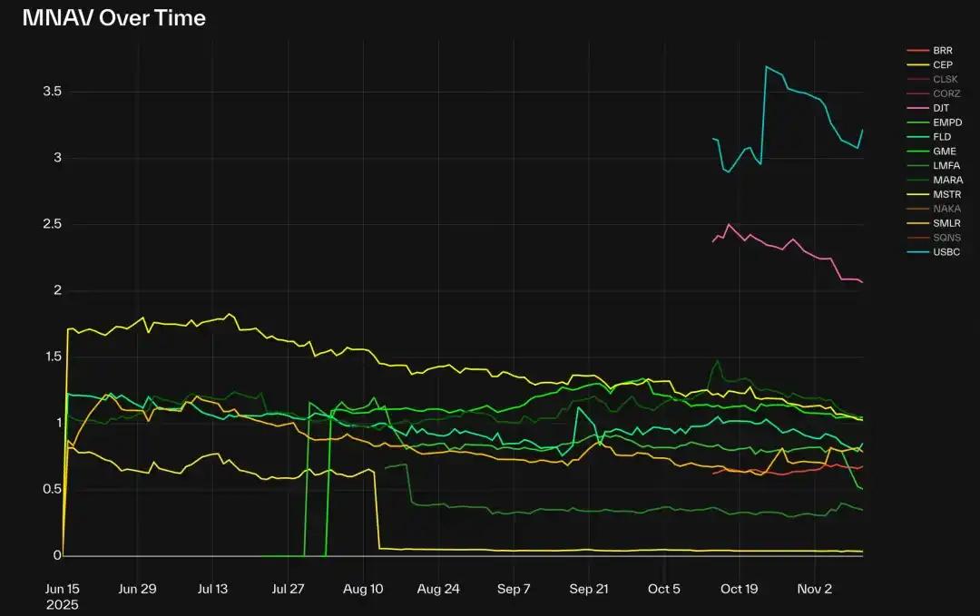 截至今日,在 BTC DAT 类别中,Strategy (MSTR)、GME 和 MARA 在近期市场调整后均接近 1.0。但大多数其他 BTC DAT 的 mNAV 均低于 1.0,其中 EMPD 最低,约为 0.5。