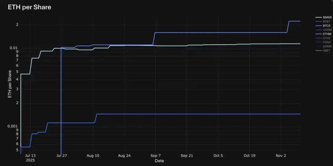 在追踪的 30 只 DAT 中,很少有公司能沿稳定上升趋势增长每股数字资产。值得注意的例外包括 Strategy (MSTR)、BMNR、HSDT、ETHM、BTCS、CEP 和 UPXI。