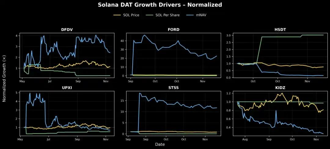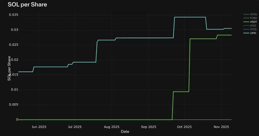 SOL DAT:HSDT 的每股 SOL 增长最显著,从 10 月到报告发布时增长 3 倍;UPXI 也稳步增长,但规模较小。DFDV 受益于市场情绪上升,但同期其每股 SOL 有所下降,表明上涨更多受市场情绪而非基本面驱动。与此同时,FORD 和 STSS 的 mNAV 均大幅扩张,但基本面价值增长基本持平,表明业绩表现受市场情绪驱动,而非资产负债表驱动。