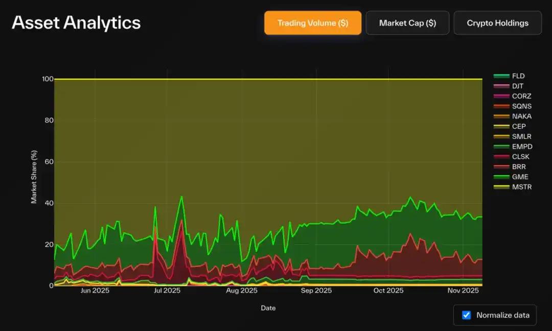 BTC DAT 中,Strategy 主导地位显著:持有 83.3% 的 BTC DAT 总持仓(占 BTC 总供应量 3.22%),占据类别内 72% 市值。GME、BRR 成交额份额增长明显,反映散户活跃度提升。