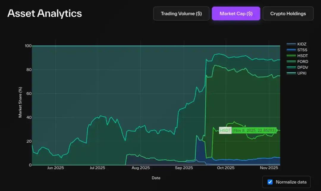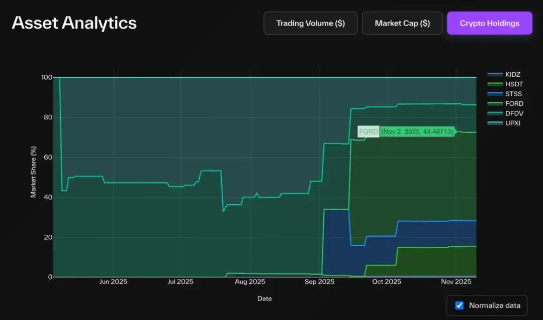 有趣的是,从交易量看,情况相反:DFDV 与 UPXI 活跃度领先 FORD。历史趋势表明二者是 Solana DAT 类别先行者,这一优势似乎延续至今,即使 FORD 后获更高 NAV,早期进入者保持的交易势头和市场关注度仍难以撼动。