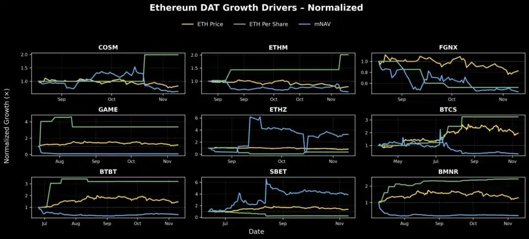 当我们对 Bitmine (BMNR) 的价格增长进行分解时,发现自上线以来,每股 ETH 稳步上涨,而 mNAV ( 情绪倍数 ) 大幅收缩。这表明其基本面依然强劲,只有市场炒作层有所降温。
