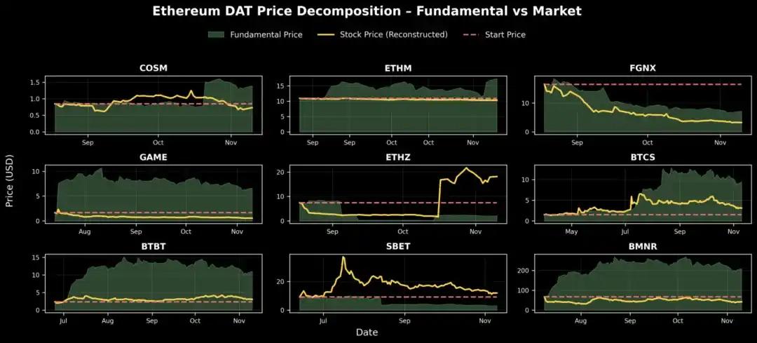 如上图所示,大多数 DAT 公司自推出以来都经历市场降温或收缩阶段。为理解其潜在发展轨迹,我们可以进一步重构每家公司的理论基本面价格——本质上是回答:「如果市场状况与 DAT 推出之日相同,那么今天的股价会是多少?」