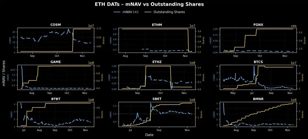 从上图可以看出,ETH DATs 在股权发行和市场情绪管理方面存在明显差异。大多数公司呈现流通股数量逐步增加趋势——表明可能进行 PIPE 或 ATM 发行。
